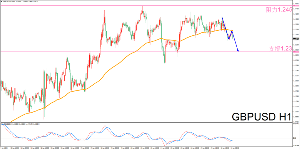 镑美昨日下跌创下新低,今日开盘后小幅反弹但目前已经收出了反转型态,且承压于长期均线之下,今日操作上偏向空方,只要不创下今日新高都预期跌至支撑1.23。