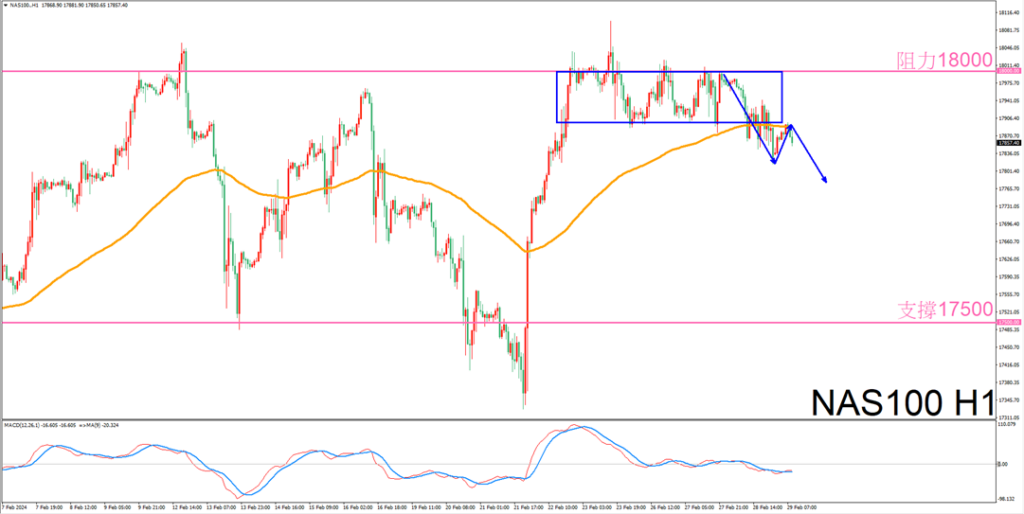 那指在进攻18000的路上越走越远,迟迟无法突破演变成多重顶的格局,后续有望展开新一轮的下跌,晚间操作上保持空方思路,先以上周大涨的50%处做为预期目标位置。