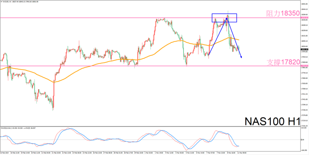 那斯达克上周周线再度收跌,虽然中间一度刷新新高,但整体的走势越来越不乐观,高位震荡越发明显,后续可能要慎防转向的可能,操作上暂时先顺着偏空思考,预计晚间会跌至支撑一线。