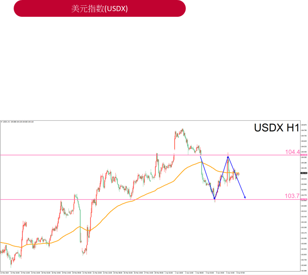 上周五强劲的非农都无法提振美指上攻,数据公布后两小时涨幅就被全数吞回,上方104.4-104.5的压力很大,预期今日晚间将会是继续回调的格局,但考虑到没有晚间没有特殊数据,操作可以保守一些。